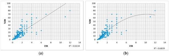 To allow a comparison with the Dutch study [], dealing with neighbors of pig farms, not only percent odor hours (%OH) were calculated but also the odor concentration (in OU/m3) at the 98th percentile (C98) again using the dispersion model GRAL. Scatterplots revealed rather a non-linear association between both markers, with only a fractional difference between a non-linear and linear association (Figure 1). The strongest linear correlation (with an R2 > 0.8) was evident (Table 1) after log transformation of %OH and logistic transformation of C98 (exp(C98)/(1 + exp(C98)).