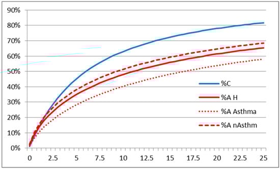 Percentage of complaints (blue, our data) and annoyed persons (red, []) per odor units at the 98th percentile. Percentage of annoyed persons reported for asthmatics (dotted line) and not asthmatic respondents (interrupted line) and for the study average (31% asthmatics, thorough line).