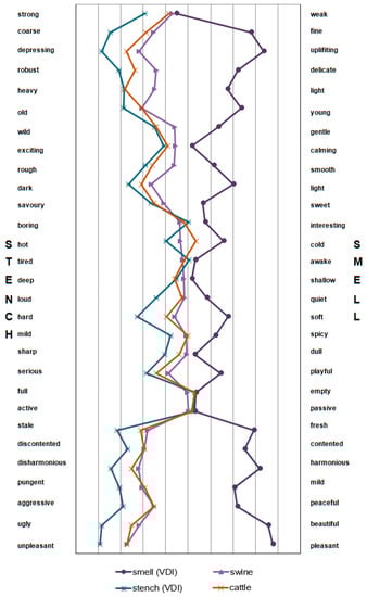 Swine is not as close to a representative stench as cattle, but overall both odors look very similar (Figure 2). A direct comparison of rating a single polar-rating for pleasantness, as it was done in French studies [,], is not possible due to the different scaling (7-categorical vs. 11-categorical), but the rating for this polar in our study gives an idea of a rather unpleasant smell which was equally rated for both swine and cattle.