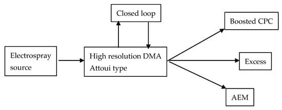 - Attoui, M.; Paragano, M.; Cuevas, J.; Fernandez de la Mora, J. Tandem DMA Generation of Strictly Monomobile 1–3.5 nm Particle Standards. Aerosol Sci. Technol. 2014, 47, 499–511. [Google Scholar] [CrossRef][Green Version]