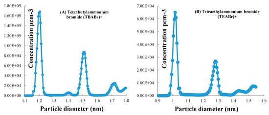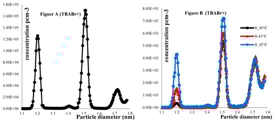 Figure 5A gives the mobility diameter distribution of TEABr measured with the DMA and an aerosol electrometer as detector. The particle concentration measured with the electrometer is high especially for the monomer (~7 × 104 pcm−3) and 2.5 × 104 particles per cubic centimeter of air for the dimer because the solution is diluted (~100 µM). The concentrations measured with a CPC as a detector of the DMA is lower but still high enough for ∆T = 38 °C (8 and 42 °C) for example.