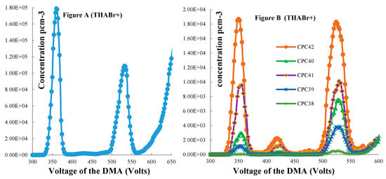 Figure 3 gives the mobility diameter distributions of the THABr as a function of the voltage of the DMA. The monomer emerges at 362 volts, the dimer at 534 Volts. The results in the Figure 3A (on the left) are given by the DMA when an aerosol electrometer is used as a detector of the DMA. The results in the Figure 3B (on the right) are given by the DMA when a boosted butanol CPC with different ∆Ts as a detector. In this study the temperature of the condenser is kept constant at 8 °C. 8 °C rather than 10 °C is chosen to have ‘large’ ∆Ts with ‘low’ saturator temperatures. High saturator temperatures may cause neutral and or ion evaporation from the clusters during their time of flight in the saturator [48,49].