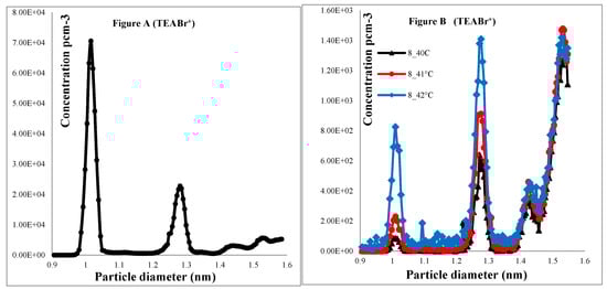 Mobility measurements of the tetraethylammonium bromide (TBABr) with a DMA. Aerosol electrometer was in use in the results given in the Figure (A) (left panel). Variable T CPC was in use for the results given in the Figure (B) (right panel).