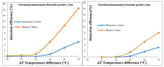 Detection efficiency of the CPC for TEABr and TBABr ions for different Ts.