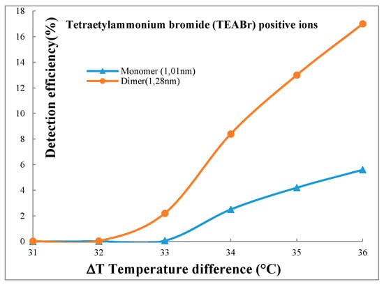 The detection efficiency of the smallest ion (monomer of the TEABr 1.01 nm) reaches 4.2% at a ∆T = 35 °C. The dimer (1.28 nm) is seen by the CPC with a DE of 13%. A difference of 10 % appears with the DE for the monomer of the TBABr with 1.20 nm diameter. There is a difference of 0.08 nm between the ions but it’s hard to think that this difference is introduced by the size and not by the higher solubility in water of the TEABr.