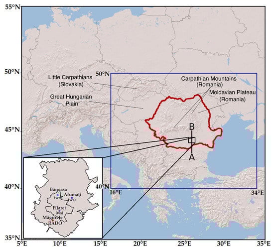 Figure 1. Study domain showing the synoptic and mesoscale (dark blue and black rectangles) areas over which analyses were performed. The red contour marks the Romanian territory. The black rectangle represents the location of Bucharest city and the measurement sites. The location of Romanian Atmospheric 3D Observatory (RADO)–Măgurele is indicated (red dot) together with the location of Băneasa (blue dot), Filaret (magenta dot) and Afumaţi (dark blue dot) weather stations. The A–B line shows the position of the cross-section in used in Section 3.2.