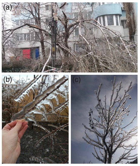 Figure 2. (a) Freezing rain impact in Bucharest on 25 January 2019 and (b,c) ice accumulation in Măgurele (southwest of Bucharest). In (b) the ice layer on the branches was estimated at 2–4 cm.