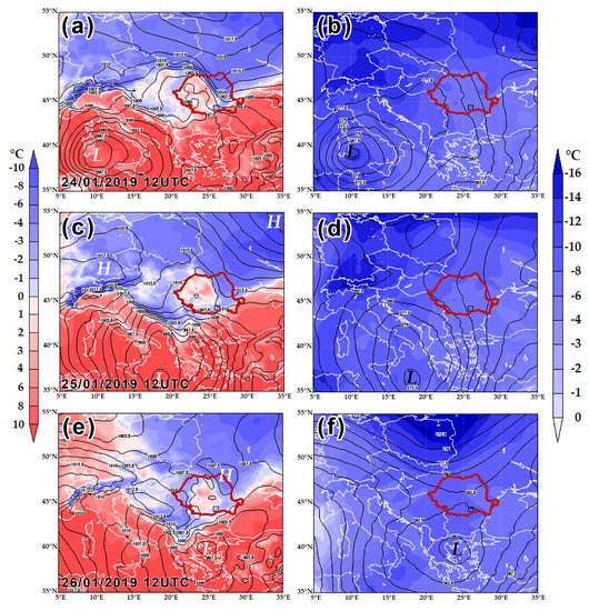 On 24–26 of January 2019, Central and Eastern Europe were under the influence of an anticyclonic regime which determined the advection of polar air masses toward these regions. Southern Europe was directly influenced by an intense Mediterranean cyclonic activity (Figure 3a,c,e).