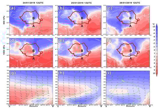 Figure 4. Regional and local analysis of freezing rain event during 24–26 January 2019 at 12 UTC from ERA5. (ac) shows temperature at 900 hPa ( C, shaded according to the scale every 1 C between −4 C–4 C and every 2 C for the remaining contours between −10 C–10 C). (df) temperature at 1000 hPa (as in ac). (gi) the south-north vertical cross section at 26 E (A–B, Figure 1) showing temperature (as in a–c), relative humidity (green dotted contours, 5% increments) and wind profile (one pennant, full barb, and half-barb denote 25, 5 and 2.5 m s 1 , respectively).