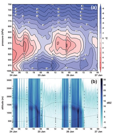 The time series of temperature profile over Bucharest area, performed for the closest ERA5 grid point to Măgurele city (Figure 5a) between 24 Jan 00 UTC and 27 Jan 00 UTC, emphasize the presence of a warm layer with a maximum temperature greater than 3 C around 900 hPa. The cold layer (lower than 2   C) is clearly shown between 24 Jan 12 UTC and 26 Jan 18 UTC (Figure 5a). This thermal structure leading to freezing rain shows similarity with the MRR measurements. The attenuated radar reflectivity shows the presence of a melting layer (i.e., bright band) between 1000–1400 m with values for radar reflectivity >20 dBz (Figure 5b).
