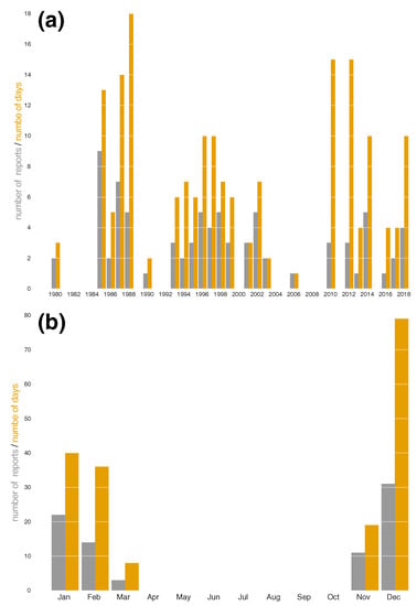 Figure 6. (a) The annual distribution of the number of freezing rain reports (orange bars) and the number of freezing rain days (i.e., days with a least one reports of freezing rain, grey bars) and (b) the monthly distribution of the number of freezing rain reports and the number of freezing rain days between 1980–2018 based on SYNOP observation from Băneasa station.
