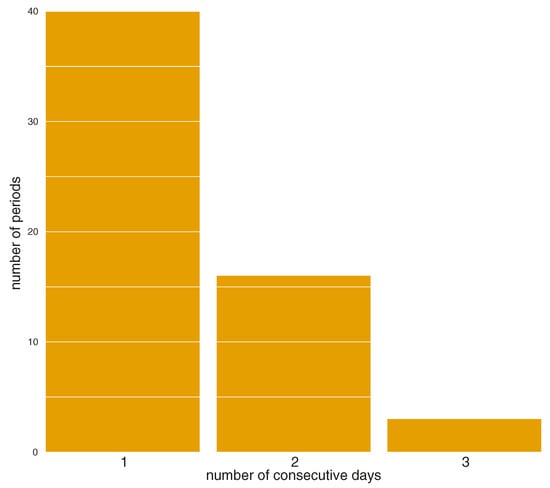 To account for the severity of freezing rain events in the United States and Canada, the duration of the event was considered as proxy [22]. Long-duration events being those in which at least six hours of freezing rain were reported. A similar approach could not be applied to the surface observations dataset used in this article, because our dataset contains hourly reports only for 2007–2018. The number of hours of freezing rain cannot be unambiguously determined from our dataset, given that between 1980–2016 the reports were made every three hours. Instead of using the hours of freezing rain, the number of consecutive freezing rain days was used as a proxy for the event severity. Thus, all freezing rain days between 1980–2018 in Bucharest were divided into 59 non-overlapping periods (Figure 7). Moderate-duration events (i.e., two consecutive freezing rain days) represented 27% (16 periods) of all non-overlapping periods and long-duration events (i.e., three or more consecutive freezing rain days) represented 5% (3 periods). Even if the thresholds (i.e., number of consecutive days) for moderate and long-duration events are subjective, we believe that they allow (1) the identification of high-impact freezing rain events (i.e., 2–3 consecutive days), and (2) the construction of a dataset with high-impact events. Thus, the event studied in this article had the largest number of hours with freezing rain, compared with other events that occurred between 2007–2018.