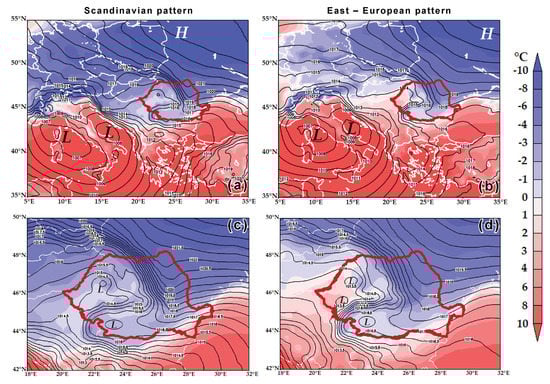 The 20 moderate and long-duration freezing rain events that occurred between 1980–2019 (including the case analyzed in this article) are associated with two main sub-synoptic patterns. These patters leading to Carpathian lee cyclogenesis are differentiated based on the origin of high-pressure system: Scandinavian origin (12 cases) (Figure 8a) and East European origin (7 cases) (Figure 8b) (Table 1). One event could not be included in the two main patters associated with freezing rain events over southern Romania, the Lothar windstorm from 26–27 December 1999 [42]).