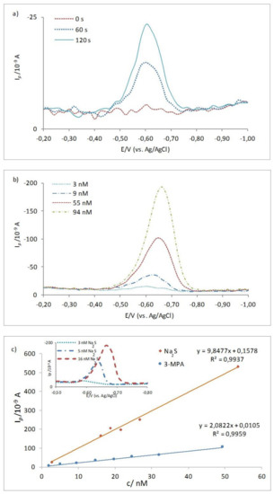 Cathodic striping square wave voltammetry (CSSWV) curves showing (a) accumulation effect in 9 nM methyl 3-mercaptopropionate (3-MPA) electrolyte solution; (b) effect of increasing concentration of the 3-MPA, and (c) calibration curves for the 3-MPA and Na2S, with insertion of CSSWV curves for increasing sulfide concentration in electrolyte solution. Experimental conditions: Ed = −0.2 V, A = 25 mV, f = 80 Hz, ta = 120 s.
