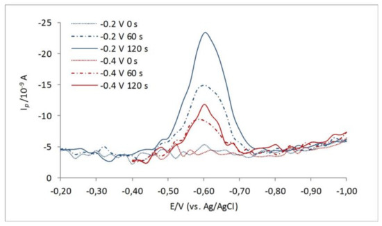 However, the accumulation effect is more expressed in the case of HgS. As already shown, the HgS reduction is not influenced by changing the deposition potentials from 0 to −0.5 V [13], and the HgS reduction peak remains the same whether it is accumulated at −0.2 or −0.4 V. In other words, by selecting these potentials it is possible to make a rough distinction between organic and inorganic S compounds [2,13,16] since majority of organic RSS would not deposit HgS at Hg.