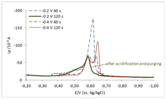 Herein, note that with longer accumulation time at Ed = −0.2, only one peak appears. While by deposition at Ed = −0.4 V, and longer deposition, the HgS reduction is also expressed. The acidification step assures that all volatile RSS (sulfide here) will be removed from the mixture, and only non-volatile RSS will remain.