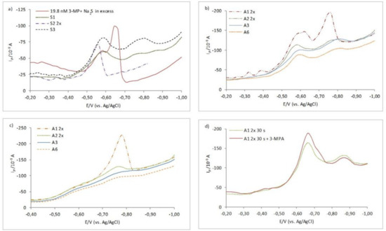 CSSWV curves recorded in the WS fraction of (a) three consecutive Spring 2016 aerosol samples (S1, S2, and S3). Red-solid line corresponds to CSSWV scan of the electrolyte containing 19.8 nM 3-MPA spiked with Na2S; (b) four consecutive Autumn 2016 aerosol samples (A1, A2, A3, A6); (c) effect of different deposition potential (Ed = −0.4 V) for Autumn samples A1, A2, A3, A6. ta = 120 s for a–c; (d) addition of the standard 3-MPA in Autumn sample A1, after the acidification and purging step, ta = 30 s. Please note that pH in this sample was readjusted to 10 after acidification, which influenced the peak position. The best response in samples S2 and A1 was obtained after 2× dilution of original WS aerosol fractions. These samples have the highest surface-active substance (SAS) content. Other experimental conditions: Ed = −0.2 V, A = 25 mV, f = 80 Hz.