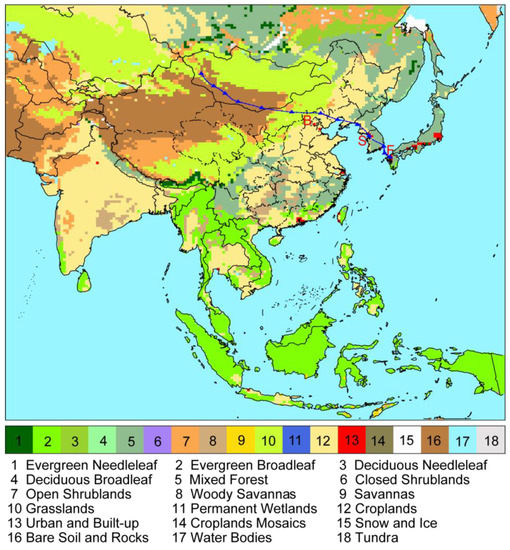 Model domain and land use categories by Moderate Resolution Imaging Spectrometer (MODIS) data. B, S, and F indicate Beijing, Seoul, and Fukuoka. The blue line with triangle markers (every 6 hours) is the 72-h backward trajectory from Fukuoka at 20:00, on 6 May 2017 (JST).