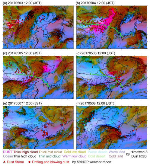 Dust RGB imageries with the surface synoptic observations (SYNOP) sites where dust weather occurred (red triangle for dust storm and circle for drifting and blowing dust) on each day (a–f) between 3 May and 8 May 2017 (JST). The green lines with triangle markers (every 6 h) in (c) and (d) show the 48-h backward trajectory from Fukuoka at 20:00, on 6 May 2017 (JST).