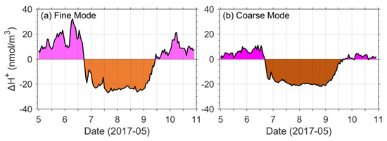 Figure 5 shows ACSA observed ΔH+ of fine (fΔH+) and coarse (cΔH+) aerosol. When the PM2.5 and PM10 were dominated by non-dust aerosol before 6 May 2017, at 18:00, both fΔH+ and cΔH+ were positive. After that, both became negative, since dust came to Fukuoka, according to the model results, as shown in Figure 4, which indicated that the dust aerosol had a high alkalinity and was a major component of both PM2.5 and PM10.