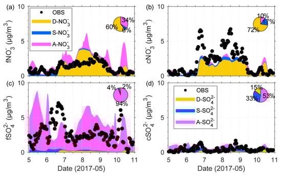 Time series of observed (black dots) and simulated (color-shaded) NO3− (a,b) and SO42− (c,d) in fine (a,c) and coarse (b,d) mode at Fukuoka. The dark yellow, blue, and magenta shades represent the simulated D-, S-, and A-NO3− and SO42−, respectively. The pie charts show the fraction from each chemical pathway of NO3− formation.