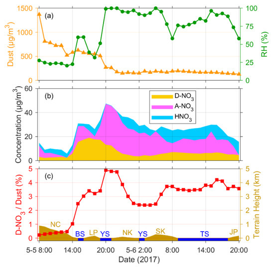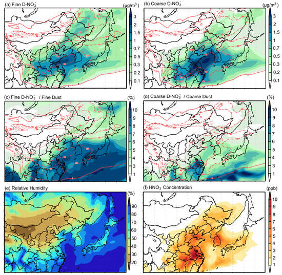 Figure 9 shows the horizontal distribution of average fine (Figure 9a,c) and coarse-mode (Figure 9b,d) D-NO3− concentrations and the ratio of D-NO3− to dust concentrations by shades, and dust concentrations by lines, as well as the RH and HNO3 concentration during 3–11 May 2017.