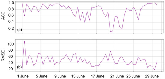Spectral analyses of the meridional winds at 250 hPa confirms the change in the behavior of the Rossby wave packet (Figure 3). In this spectral analysis, the flow over the 10 day period from 6 to 15 June is characterized by wavenumbers between 5 and 10 with a peak near wave number 8 (Figure 3a). These wavenumbers are within the range commonly found in middle latitude flows, as for example [38] found that Rossby wavenumbers between 6 and 9 dominate during middle latitude summers. The wave energy shifts dramatically to higher wave numbers of between 8 and 13 (Figure 3b) for 18 to 27 June. This time range included the prolonged period of lower ACCs in Figure 1. As mentioned earlier, Tribbia and Baumherner (2004) [30] linked higher wavenumber baroclinic disturbances to rapid error growth. These higher wavenumber disturbances are (Figure 3b) also associated with rapid movement of the wave packet as evidenced with a change in the frequency from centered on approximately 0.1 for the period from 6 to 15 June to a frequency of just below 0.3. This higher frequency implies that the period for disturbances would approach 2–4 days rather than the 7 to 10 days with the more typical synoptic-scale waves. The power spectra for June over the years 1979–2018 (Figure 3c) reveals that slow moving wavenumbers (4 to 9) are the most commonly occurring wave disturbance consistent with [38], while Figure 3d suggests that the rapidly moving waves observed during 18 to 27 June were a relatively rare occurrence.