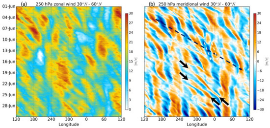 Hovmoller plot of 250 hPa winds averaged between 30° N and 60° N from ECMWF Reanalysis (ERA)-5 reanalysis [37] for June 2015. (a) Zonal wind component, (b) meridional wind component with the dashed line representing a qualitative designation of a Rossby wave packet moving downstream with the group velocity, the dotted white line corresponding to the phase speed of the individual troughs and ridges, and the black arrows indicating rapidly propagating individual disturbances.