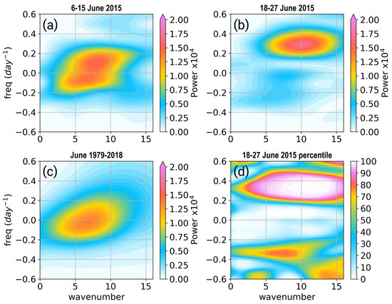 Spectral analysis of the meridional winds at 250 hPa from the ERA-5 reanalysis [37] averaged over 30 to 60 N latitude and 270 to 360 E longitude. (a) For the period of 6 to 15 June 2015, (b) for the period of 18 to 27 June 2015, (c) for climatology as indicated by June 1979–2018, (d) the percentile of the June climatology in the power spectra for the 18 to 27 June 2015 period.