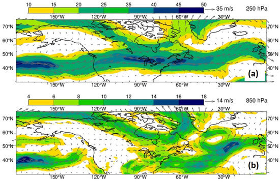 Winds from the ERA-5 reanalysis [37] averaged over the time period from 18 to 24 June 2015. (a) Winds speed (m s−1) and contoured at the 250 hPa level to show the regions of peak flow. (b) As in (a) but for the 850 hPa level.