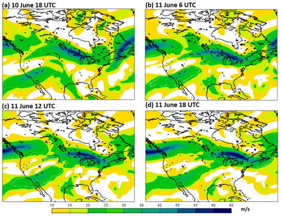 Wind speed (m s−1) contoured at the 250 hPa level from the ERA-5 reanalysis [37] for 10–11 June 2015. (a) 18 UTC on 10. (b) 6 UTC on 11 June. (c) 12 UTC on 11 June. (d) 18 UTC on 11 June. The velocity scale is shown at the bottom of the plot.