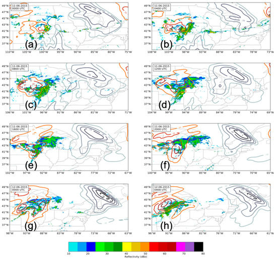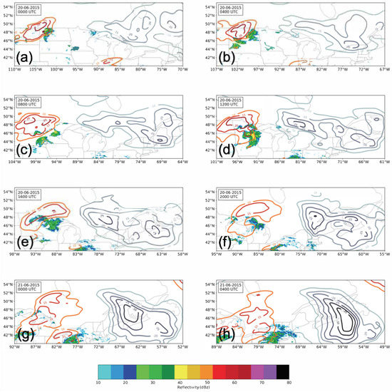 Meridional winds (m s−1) at the 250 hPa level from the ERA-5 reanalysis [37] (color contours with red southerly and blue northerly winds, respectively) and the radar reflectivity in dBZ with the scale shown at the bottom of the figure. (a) 00 UTC on 11 June. (b) 04 UTC on 11 June. (c) 08 UTC on 11 June. (d) 12 UTC on 11 June. (e) 16 UTC on 11 June. (f) 20 UTC on 11 June. (g) 00 UTC on 12 June. (h) 04 UTC on 12 June 2015.