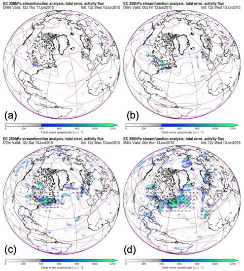 Streamlines, error amplitude, and error in the wave activity flux for the ECMWF IFS forecast initialized at 12 UTC on 10 June 2015 for (a) 24 h, (b) 36 h, (c) 72 h, and (d) 84 h forecasts.