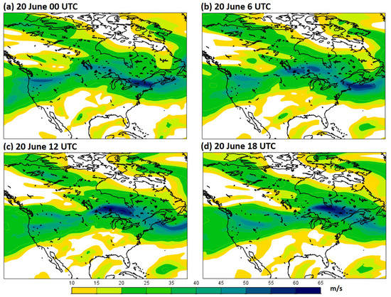 Wind speed (m s−1) contoured at the 250 hPa level from the ERA-5 reanalysis [37] for 20 June 2015. (a) 00 UTC, (b) 06 UTC, (c) 12 UTC, and (d) 18 UTC on 20 June.