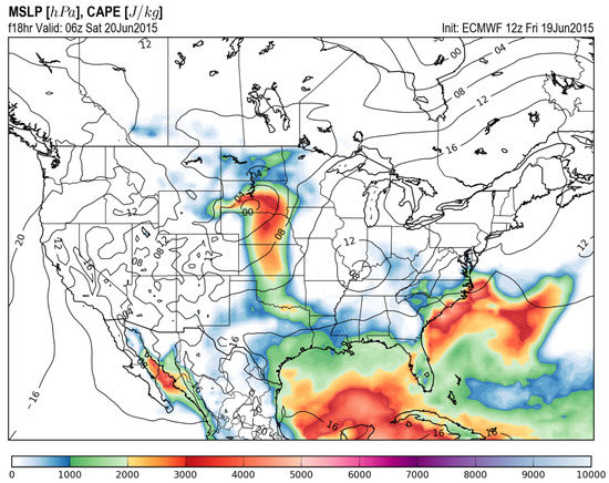18 h forecast by the ECMWF IFS initialized at 12 UTC on 19 June and valid at 06 UTC on 20 June. The Convective Available Potential Energy and sea-level pressure are shown.