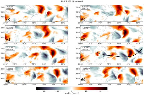 Depiction of the meridional wind (m s−1) from the ERA-5 reanalysis [37]. (a) 00 UTC on 20 June. (b) 12 UTC on 20 June. (c) 00 UTC on 21 June. (d) 12 UTC on 21 June. (e) 00 UTC on 22 June. (f) 12 UTC on 22 June. (g) 00 UTC on 23 June. (h) 12 UTC on 23 June 2015. during the period of 00 UTC on 20 June through 12 UTC on 23 June 2015. The short wavelength Rossby wave packet is designated with a fine black line in the panel for 12 UTC on 22 June.