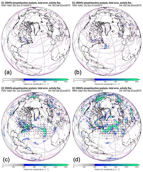 Streamlines, error amplitude, and error in the wave activity flux for the ECMWF IFS forecast initialized at 00 UTC on 20 June 2015. (a) 24 h forecast, (b) 36 h forecast, (c) 72 h forecast, and (d) 96 h forecast.