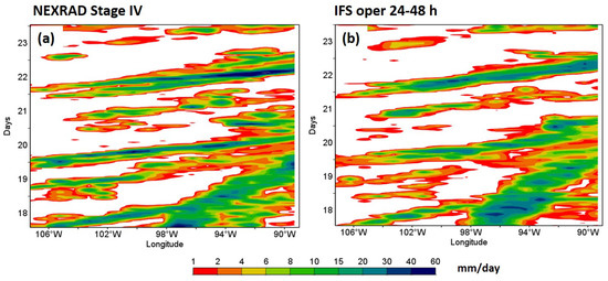 Hovmoeller diagrams of hourly rainfall (mm) for the period from 00 UTC on 18 June to 00 UTC on 23 June 2015. The area covered ranges from 33.2 N latitude and −89 longitude to 44.5 N latitude and −107.2 longitude. (a) NEXRAD-NCEP (Next Generation Radar—National Center for Environmental Prediction) stage IV rainfall estimates. (b) Average of the 24 to 48 h forecast from the ECMWF/IFS.