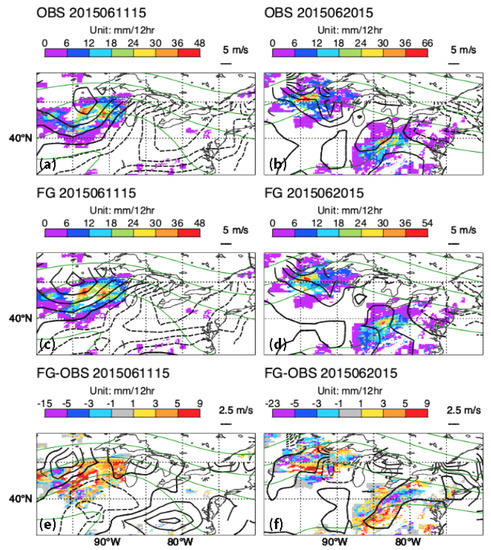Spatial distribution of the 200 hPa streamlines, meridional winds, and the rainfall for the 11 June and 20 June cases. The observations of the meridional winds are from aircraft reports and the observed rainfall estimated from the operational radar network. The first guess of the ECWMF IFS is also shown and all fields are on the grid utilized in the data assimilation system at 15 Local Standard Time (UTC-6) with errors calculated over a 12 h time window of +3 to +15 h. The panels of the left represent the (a) observations (OBS), (c)first guess (FG), and (e) difference fields (FG-OBS) for 11 June, while panels on the right (b), (d) and (f) represent the same fields, but for 20 June.
