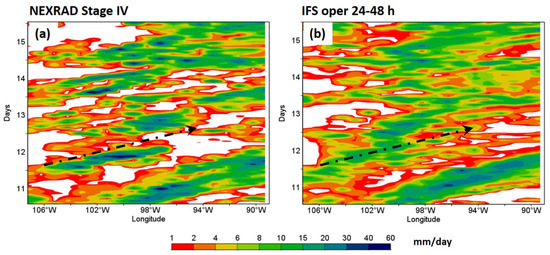 Hovmoeller diagrams of hourly rainfall (mm) for the period from 00 UTC on 11 June to 00 UTC on 16 June 2015. The area covered ranges from 33.2 N latitude and –89 longitude to 44.5 N latitude and −107.2 longitude. (a) NEXRAD-NCEP stage IV rainfall estimates with the dot-dash arrow indicating convection moving eastward at 17 (m s−1) as found in [49]. (b) Average of the 24 to 48 h forecast from the ECMWF/IFS.