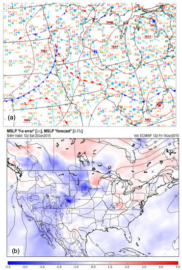 Characteristics of the surface weather for 12 UTC on 29 June. (a) Operational surface analysis from the NOAA’s National Weather Service’s Weather Prediction Center (NWS/WPC) showing surface station plots in standard format, sea level pressure (hPa - 1000), temperature, dew point temperature, and rainfall along with a surface pressure and frontal analysis (standard symbols). (b) The 24 h forecast for 12 UTC on 20 June by the ECMWF IFS initialized at 1200 UTC on 20 June 2015. The contours represent the predicted surface pressure (mb) and the color coding represents the error in surface pressure (forecast - observed.)