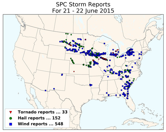 While these points raise the issue of linkage between Rossby waves and warm season convection, the extent to which the concept of DRWs may be a relevant concept for MCCs and other MCSs over this region, the surface cyclonic circulations are not particularly dramatic and, hence, the extent of the coupling may likely be relatively weak. Still these results suggest that convection during bust events is strong enough to be linked to and impact jet stream dynamics (i.e., synoptically forced). The subsequent development of the surface low and the advection of a high CAPE air mass suggests a positive impact of the large-scale response on the MCS. The linkages between severe weather over North America and forecast errors in the medium-range over Europe was noted earlier by Rodwell et al. [12] study of uncertainty growth in the ECMWF ensemble system. The case investigated for that study had 631 high wind, 194 hail, and 89 tornado events over the continental U.S. recorded in the official severe weather reports from the NOAA Storm Prediction Center. The 9–11 April 2011 case studied in the earlier work of Rodwell et al. was also associated with a major severe weather outbreak as 917 severe weather reports were issued during this period. For 21 and 22 June 2015 (Figure 17) case in our study, severe weather was again quite extensive with well over 700 reports that were primarily related to wind (548 reports with 18 over 65 knots), but included numerous tornadoes (33 reports) and hail (152 with 29 larger than 2” in diameter). The general spatial pattern of the reports is consistent with a pattern of rapidly eastward moving systems consistent with the short wavelength Rossby wave packets (Figure 11). News reports generally noted the similarity of the radar images and storm damage on 22 June to a derecho and noted that the impact included 500 flights canceled from Chicago alone. The characteristics of the storm damage suggest that the case meets the classic definition of a derecho event [62] with the radar observations taking on the general bow shaped criteria suggested by [65].