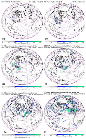 Streamlines, error amplitude, and error in the wave activity flux for the ECMWF IFS forecast initialized at 12 UTC on 21 June 2015. Forecast at (a) 24 h, (b) 36 h, (c) 48 h, (d) 60 h, (e) 72 h, and (f) 96 h.