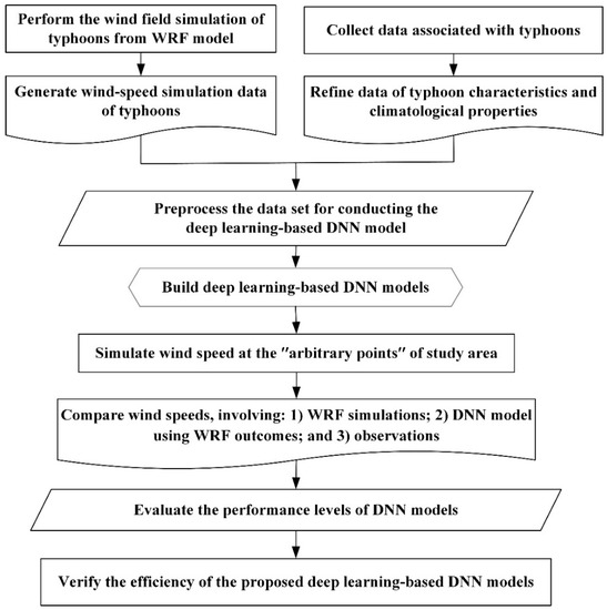Figure 4 presents the flowchart of the WRF numerical model simulation. The simulation procedures included the following: Setting up the computation environment of WRF model; collecting historical typhoon data required for the model simulation process, and the initial field and boundary layer data; setting up the model parameters and simulation range; verifying and validating the model; outputting and processing simulation data; producing wind-field data for each typhoon; and post-processing a dataset preparing for the use of DL-based DNN models establishing.