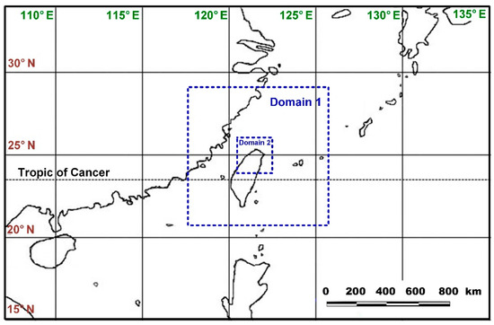 The start point for each simulation was 24 h before the CWB had issued a typhoon landing warning and the end point was 24 h after the warning had ended. In this study, the grid was set as a two-domain nested grid (Figure 5). The horizontal grid spacing for Domain 1 was 15 km (118° E–126° E, 21° N–29° N), whereas the horizontal grid spacing for Domain 2 was 5 km (121° E–123° E, 24° N–26° N). The vertical layering included 32 layers. Domain 1 was used to cover large-scale meteorological phenomena, such as typhoon movement paths, and Domain 2 was used to simulate medium to small-scale meteorological mesoscale alpha systems (200–2000 km scale), such as the effects of Taiwan’s geography on typhoon circulation. The inner horizontal grid spacing of 5 km used in this study is suggested by [19] and [43,44,45].