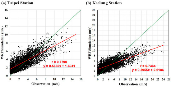 This study performed a WRF model simulation of 47 typhoon events and obtained 4416 h of simulation values after organizing the outcomes. Figure 6 displays the scatter plot with all WRF model simulation values and observed ground station (Taipei and Keelung) values. The figure demonstrates that when the wind speed at Taipei and Keelung stations was greater than 9 m/s, the WRF model simulation values underestimated the wind speed. In terms of correlation, Taipei station (r = 0.7790) exhibited a greater overall correlation than did Keelung station (r = 0.7364). Because of the effects of the terrain, the observed wind speed at Keelung station ranged from 0 to 25 m/s, whereas those at Taipei station ranged from 0 to 15 m/s, indicating that the overall wind speed within the basin (Taipei station) was slower than that in the seaside areas (Keelung station). Furthermore, the slopes of the linear regression line (solid red line in Figure 6) for Taipei and Keelung stations were 0.5665 and 0.3955, respectively. Thus, the smaller slope for Keelung station indicated that the WRF model was more prone to underestimate the wind speed at Keeling station than at Taipei station.