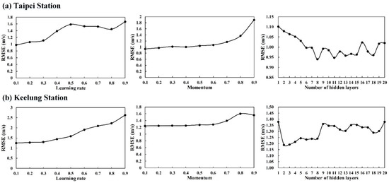 The criterion RMSE was used to evaluate the error between the simulated and observed values here. Figure 7 presents the analysis results for parameter sensitivity when constructing the Taipei and Keelung station DNN models. Typically, a lower RMSE value correlates to a lower error. Thus, this study used the result with the lowest RMSE value as the preferred solution. As illustrated, the optimal learning rate, momentum, and number of hidden layers were respectively 0.1, 0.1, and 8 for Taipei station and 0.1, 0.1, and 2 for Keelung station.