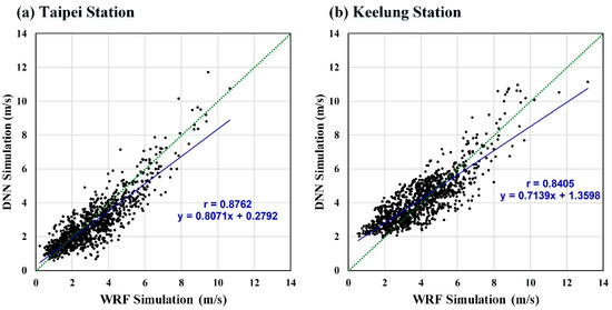 Figure 8 presents the scatterplot diagram (using validation data set; blue solid line) for the DNN simulation values and WRF simulation values for the Taipei and Keelung stations. The analysis indicated that the r values of Taipei and Keelung stations’ DNN vs. WRF were 0.8762 and 0.8405, respectively; thus, Taipei station had a greater r than Keelung station.