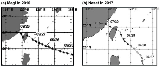 Historical typhoon tracks: (a) Megi in 2016 and (b) Nesat in 2017.