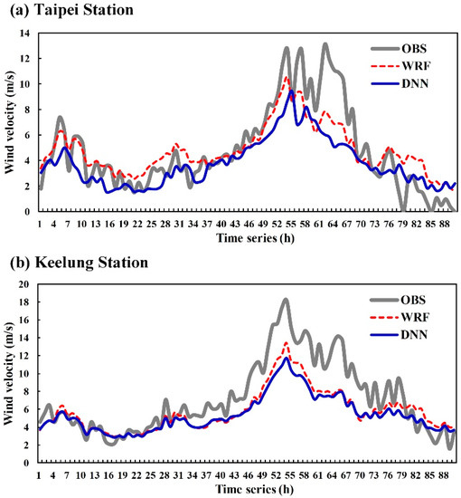 Figure 10 presents the simulation results for the WRF and DNN models. In Figure 10a of Taipei station, the WRF model outcomes (red dotted line) were mostly consistent with observed values from hours 1 to 45 (before the typhoon landed), but compared with the values observed as the typhoon was strengthening (hour 46 to hour 68), they could be seen to have underestimated the wind speed. We can see the WRF model capture wind speed trends throughout the typhoon simulation. The overall simulated wind speed for the DNN model (solid blue line) was similar to that of the WRF model, but it exhibited an even greater degree of underestimation compared with the observed values. Furthermore, Figure 10b of Keelung station demonstrates that the observed values of the WRF mode were generally consistent from hours 1 to 33. However, when the typhoon was strengthening (hours 45–72), the model underestimated the wind speed in comparison with the observed values. For the DNN model, the overall wind-speed simulation was closer to the WRF model. However, compared with the observed values, the model still exhibited underestimation.